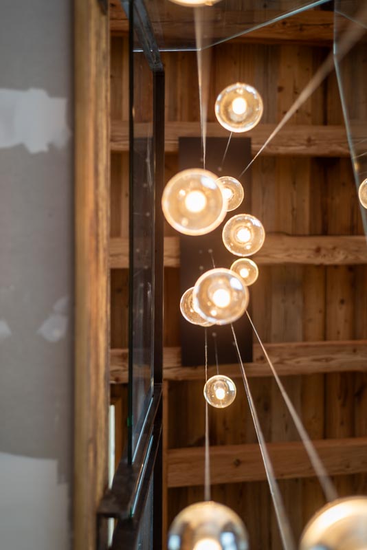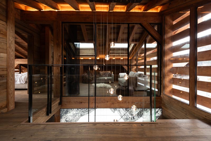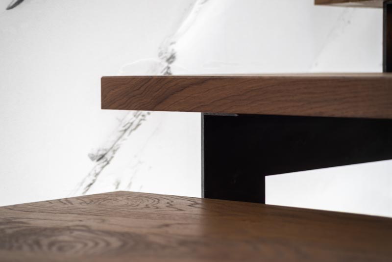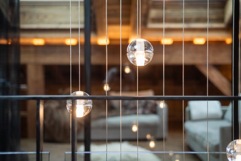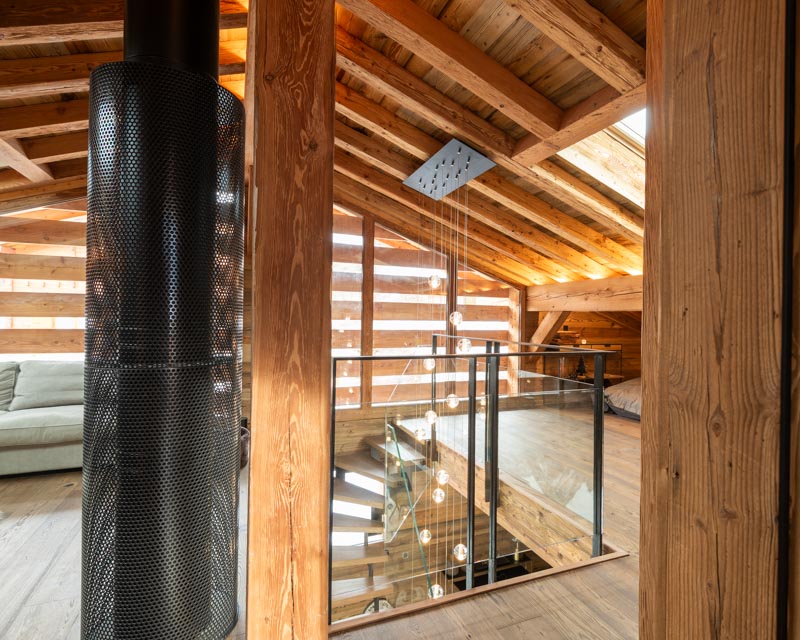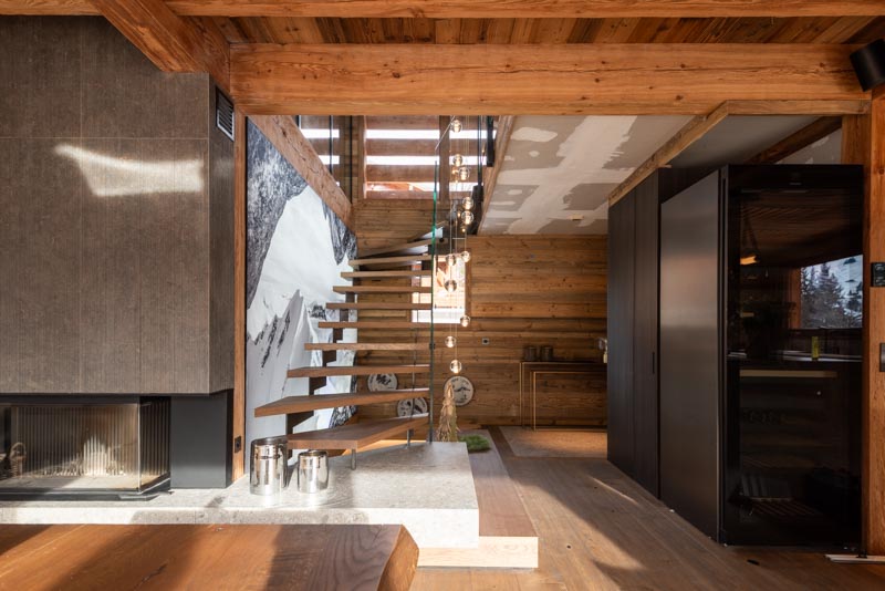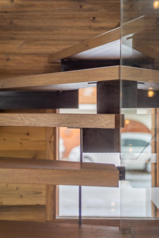 Escalier trois quart tournant avec marches en frêne et crémaillère en acier s'intégrant parfaitement a ce chalet moderne. Le rendu est épuré, design et s'accorde parfaitement avec cette grande pièce à vivre. La finition de l'acier Canon de Fusil apporte le côté authentique, le choix du chêne pour les marches apporte la noblesse et le verre des garde-corps apporte la modernité. Alliance parfaite de ces trois matériaux.